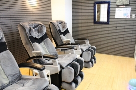 疲れを揉みほぐすマッサージ機は大好評! (利用時間:午後5時~翌9時まで)