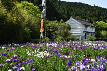 江戸時代中期に建てられた庄屋屋敷「加茂荘」と緑豊かな杉の山を背にした園内は、昔ながらの趣にあふれ、色とりどりに咲く花菖蒲がきわめて日本的な風景を作り上げています。