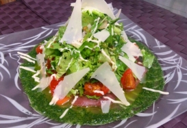 見た目も美しい「鮮魚のカルパッチョ」は鮮やかな彩りが楽しさを演出します。新鮮な魚と野菜を特製バジルソースに絡めて食べる絶品料理です。