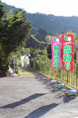 園主細野厚さんが知人の茶農家から土地を譲り受け、約20年係りで7千平方メートルを開墾し、甘みの強い品種「かおり」と果汁の多い「秋月」の計40本が植わる2千平方メートルを開放しました。