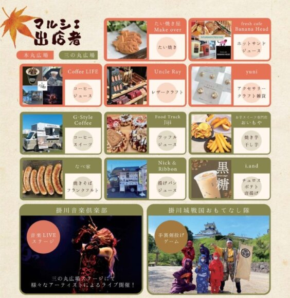 掛川城本丸広場&三の丸広場のマルシェや、手裏剣投げゲームもできる忍者イベントのほか、二の丸茶室の「もみじ茶会」など、楽しい催しがいっぱい♪