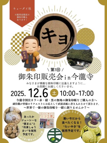 12月6日にキョーダイ社様をお呼びし、キョーダイ社様の御朱印帳をはじめ、今瀧寺別注カラー赤、ネイビー、黒の3色(いずれも無地)の御朱印帳も販売されます。