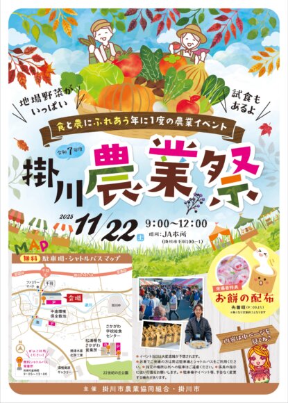 掛川の農業と農産物の魅力を、多くの人に知ってもらうことを目的としてJA掛川市と掛川市の一大イベント「掛川農業祭」が、今週末(11月22日)に開催されます!