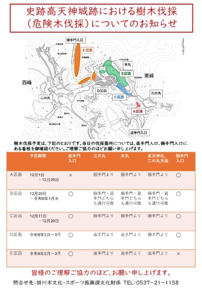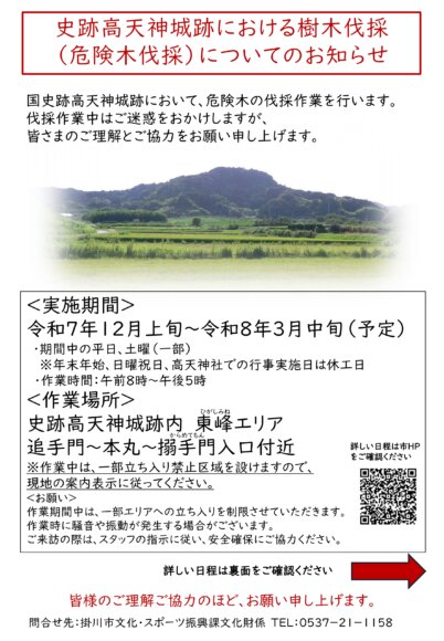 令和7年12月から令和8年3月にかけて、史跡高天神城跡では危険木の伐採が予定されています。