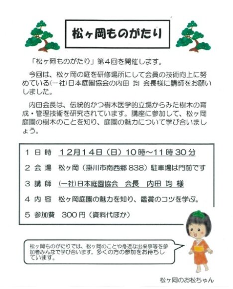 さらに12月14日(日)は、松ヶ岡の建築や掛川の文化を題材に学ぶ歴史教養講座「松ヶ岡ものがたり」が開催されます。