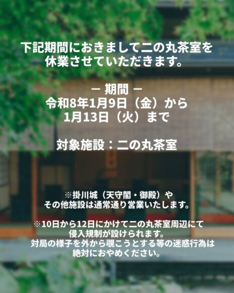 ※掛川城(天守閣・御殿)や竹の丸、その他施設は通常通り営業しています。