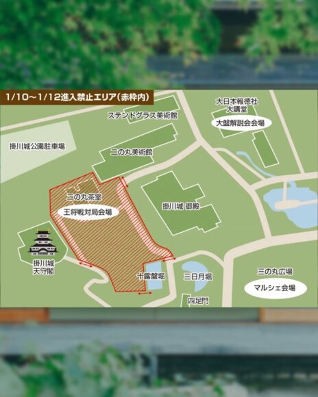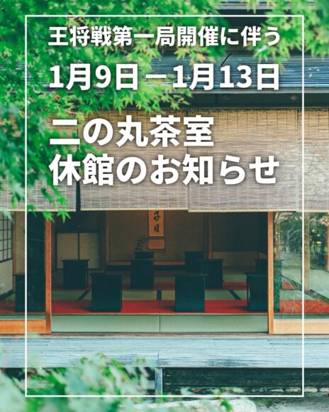 今週金曜日(1月9日)より5日間、第75期ALSOK杯王将戦第一局開催に伴い、下記期間におきまして、二の丸茶室が休館となりますので、ご注意ください。
