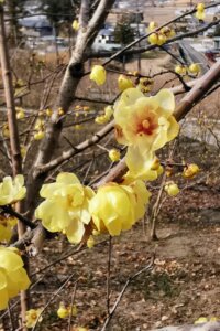 初馬(はつま)地区の「ロウバイの里」で、黄色い蜜ろうのような光沢のロウバイ(蠟梅)の花が、甘い香りを漂わせています♪
