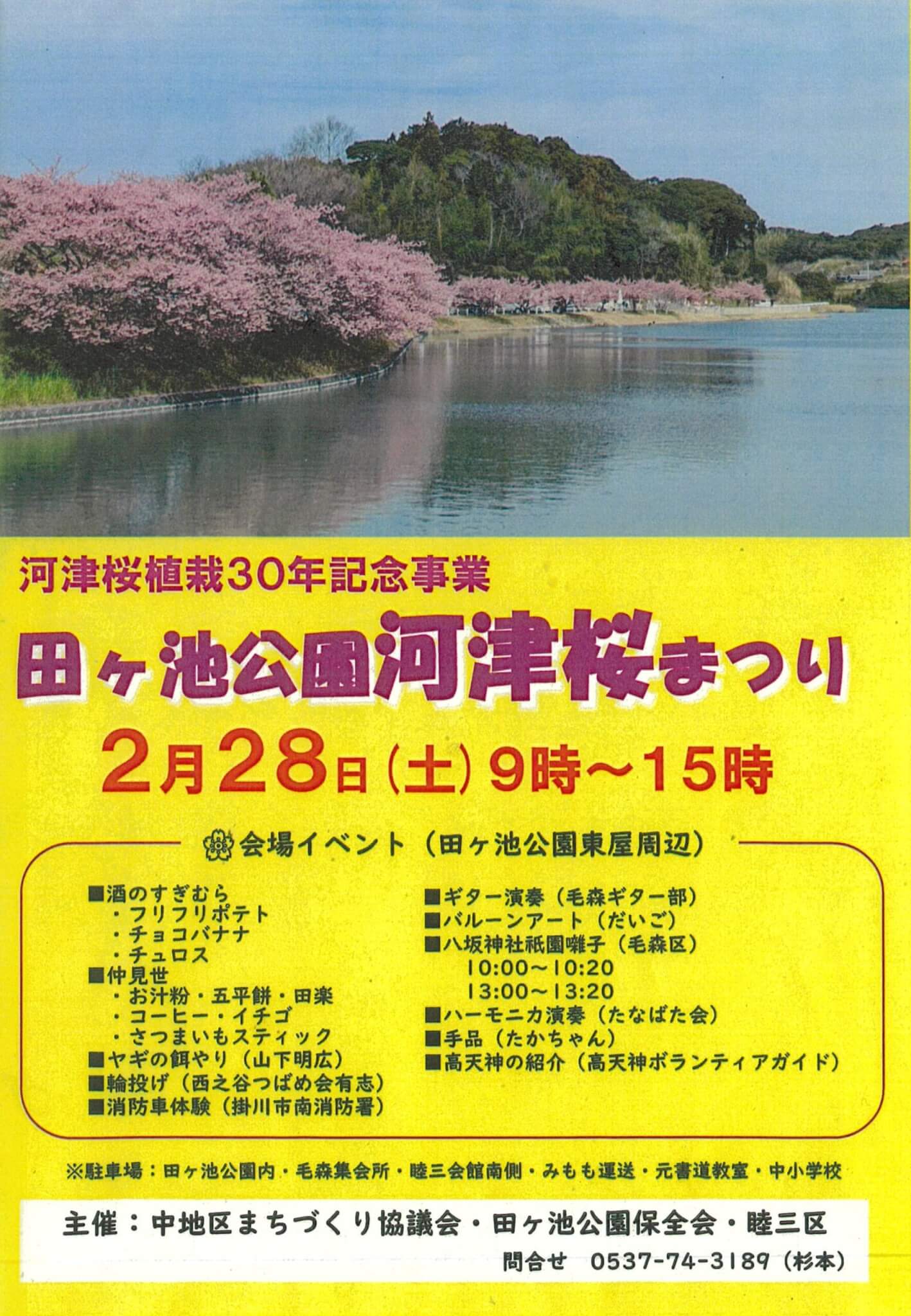 お問合せ先:中地区まちづくり協議会・田ヶ池公園保全会・睦三区 0537-74-3189(杉本)