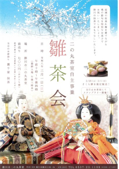 申し込み・問い合わせ:掛川市二の丸茶室 0537-23-1199(9:30~17:00)
