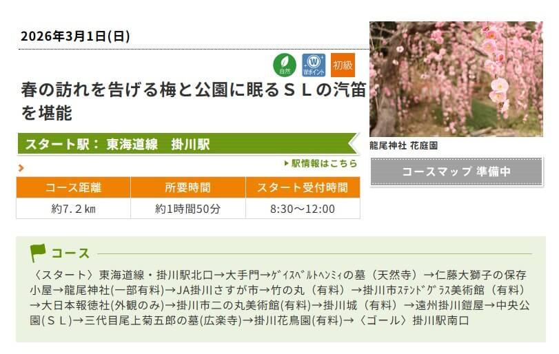 3月1日(土)、掛川駅発のJRさわやかウォーキングが開催されます♪