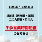 🏯掛川城・🍵二の丸茶室・🍁竹の丸「営業時間の短縮」について 2025年10月20日 掛川城3施設(掛川城・二の丸茶室・竹の丸)では、11月1日より冬季営業時間短縮となりますので、ご注意ください。 下記のとおり、営業時間(閉館時間)が16:30に短縮となります。 掛川城3施設にお出かけの際には、お気を付けください。 ◆掛川城3施設「冬季営業時間短縮」 実施期間:令和7年11月1日(土)から 令和7年12月31日(水)まで 対象施設: ・掛川城(天守閣、二の丸御殿) ・二の丸茶室 ・… ≫すべて読む